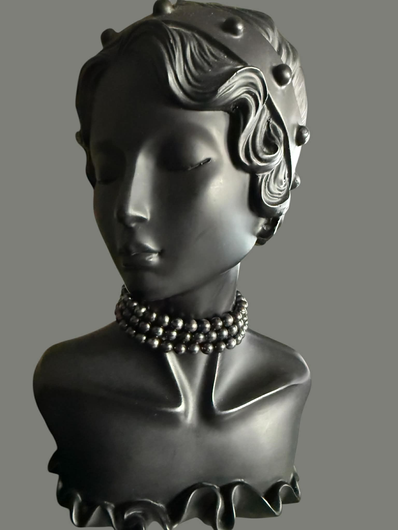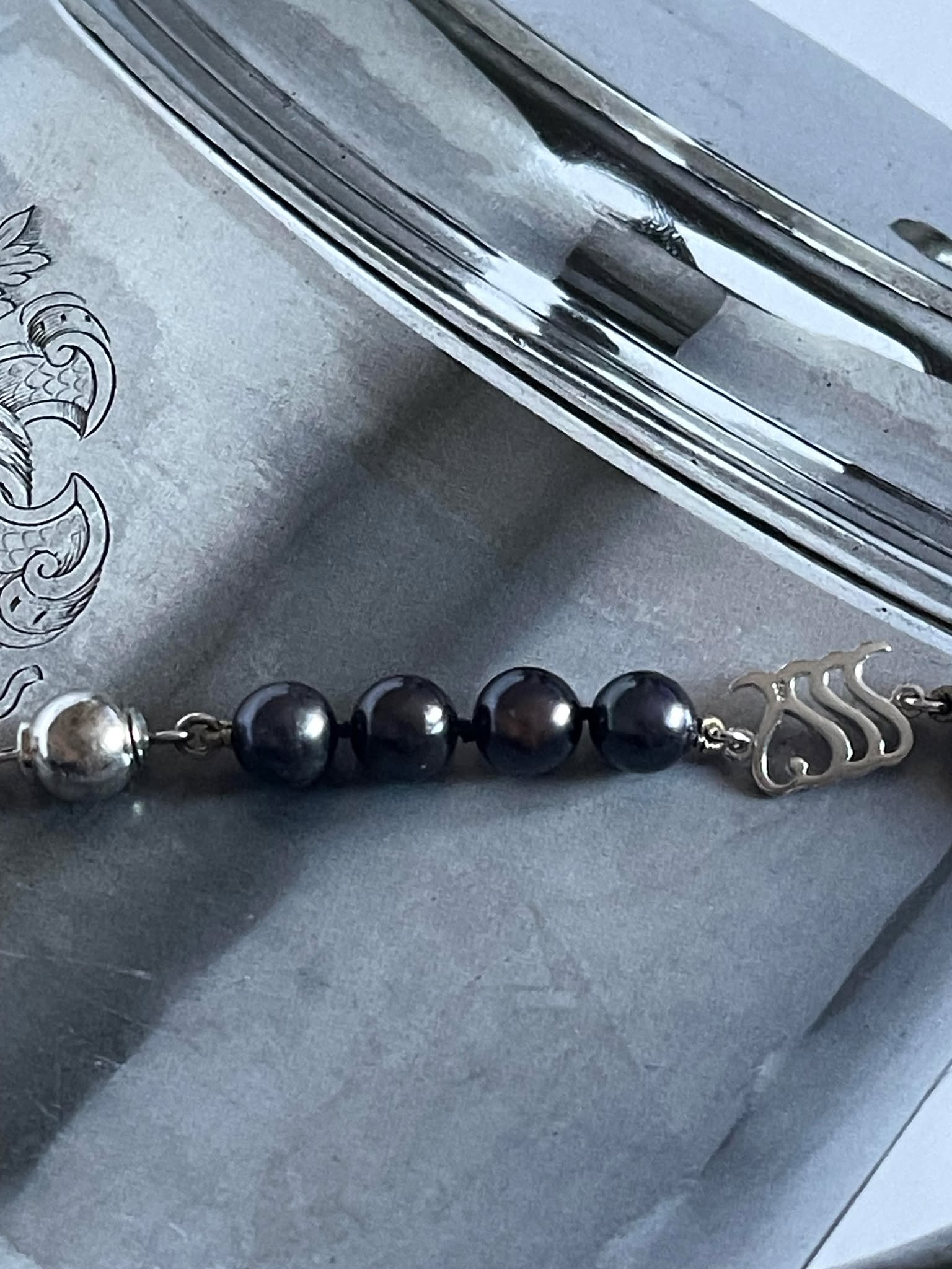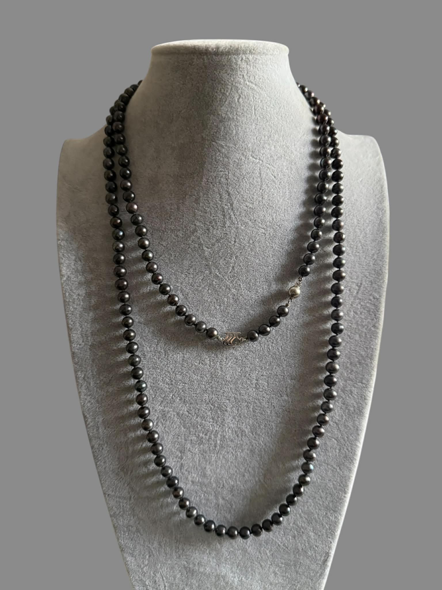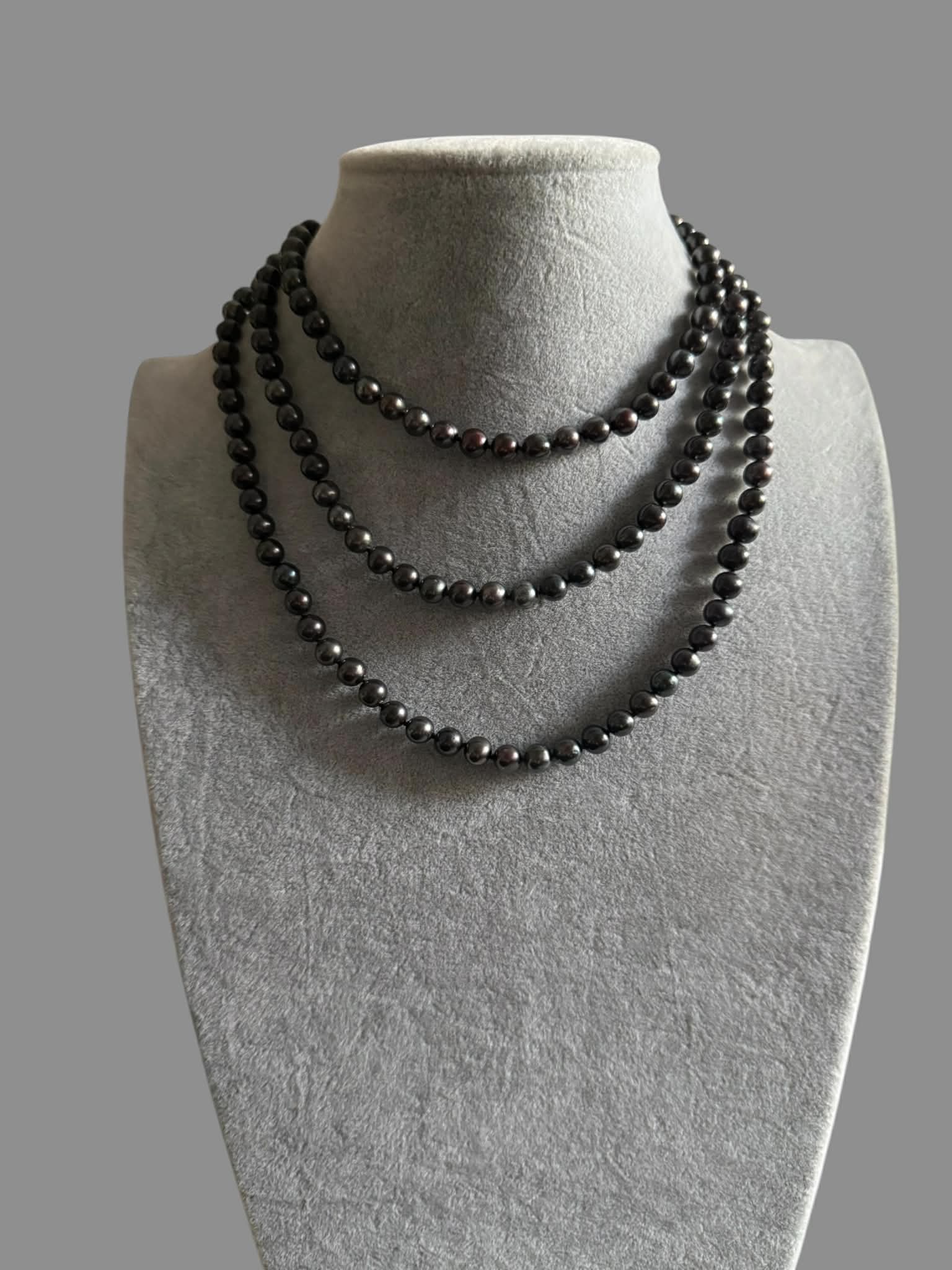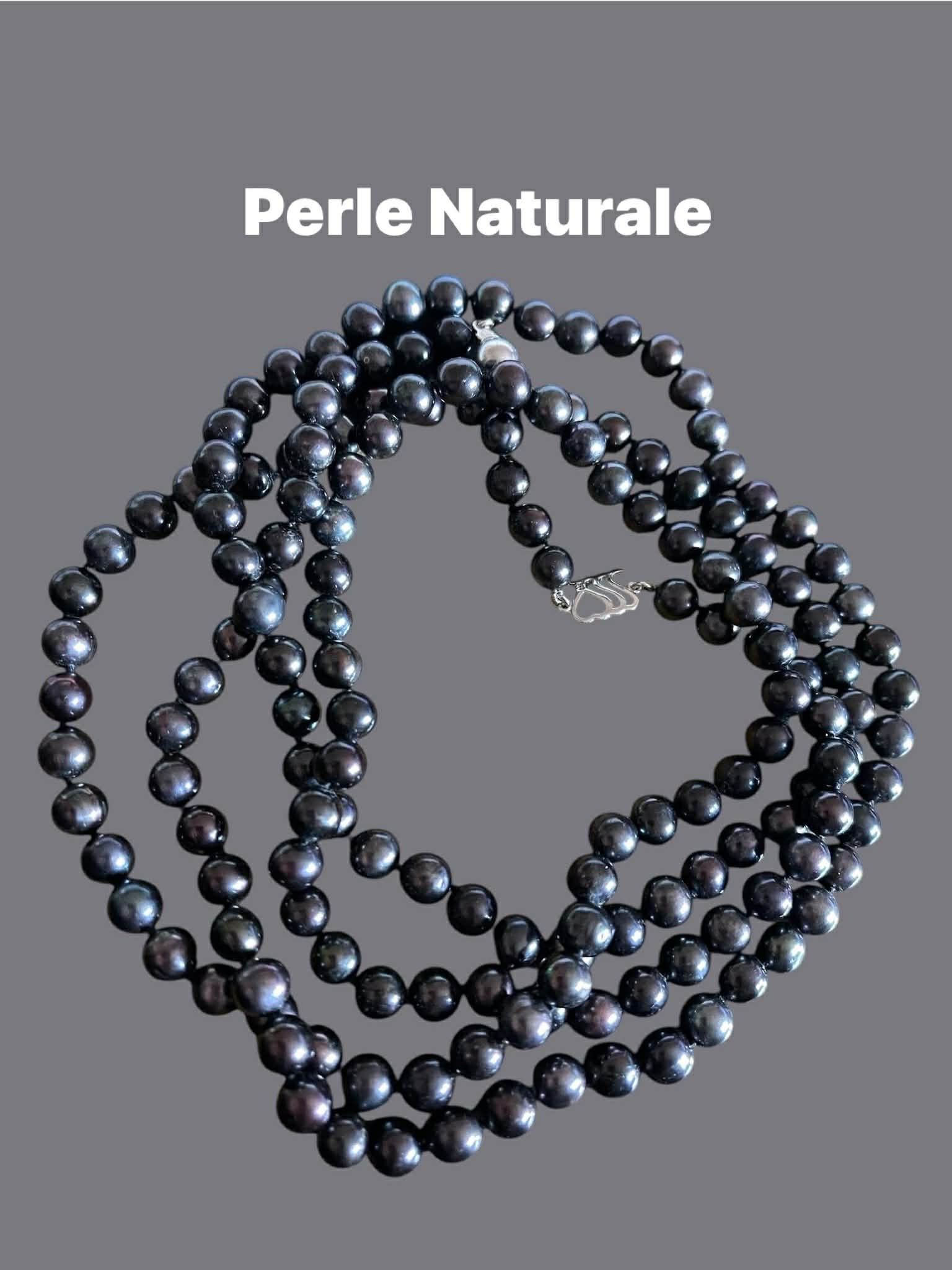 Colier cocktail – PERLE Naturale de cultura – Freshwater Pearls rotunde 6.3- 6.9 mm- culoare gri petrol -sidefat cu frumoase reflexii- lucrate cu nod